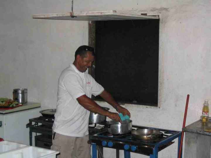 Het diner bestaat vanavond onder andere uit een lekkere vis, tambaque, de kok serveert deze zelf uit.