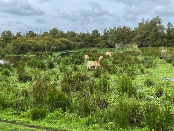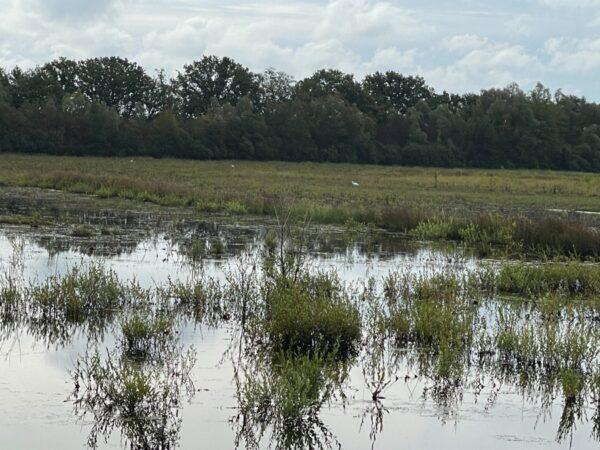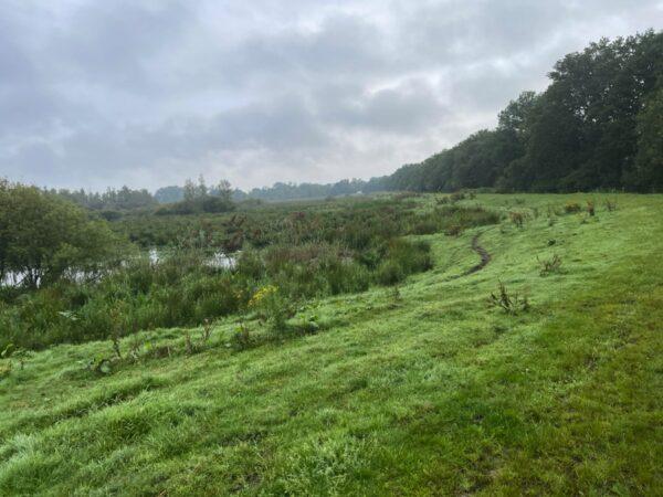 Na de grote koffiepost lopen we over een pas aangelegde dijk langs een nieuw moerasgebied.