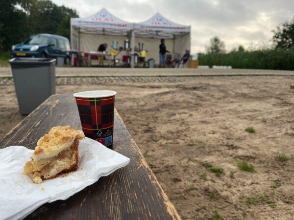 Bij de koffiepost staan OLAT-vrijwilligers ons op te wachten met een lekker bekertje verse koffie en vlaai.