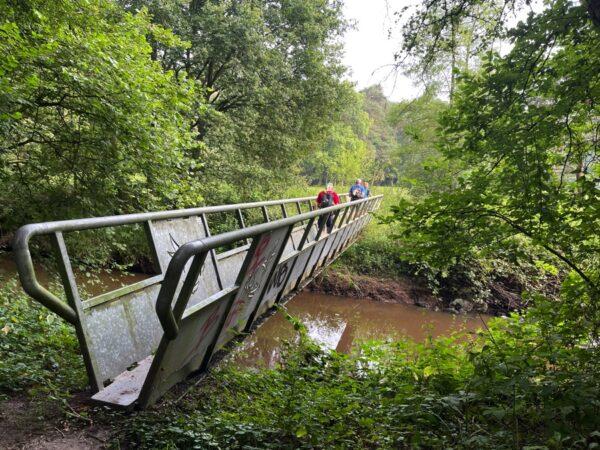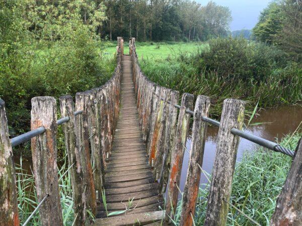 We passeren een stuw en zien op afstand een spannende hangbrug.