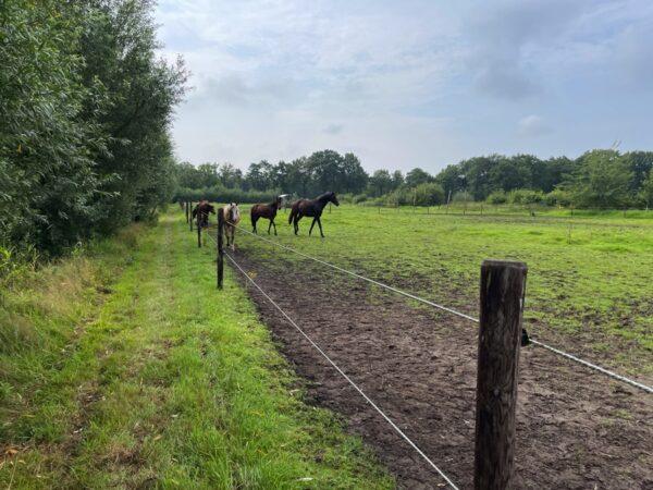 We lopen van de dijk af, passeren een mooi uitkijkpunt en gaan een klaphekje door.