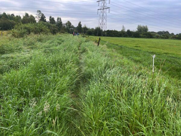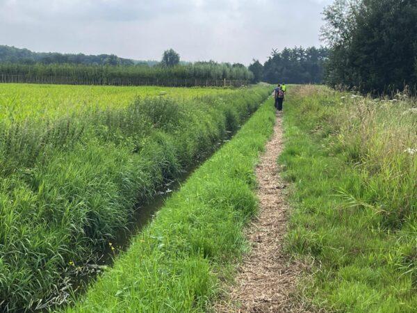 Na de rust vervolg ik de route in noordelijke richting. Even een stukje asfalt, maar dat verwisselen we snel voor een graspad langs het omleidingskanaal. We lopen dan weer rechts, dan weer links van het water.