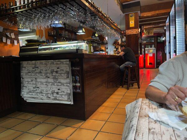 Een Duvel en een wijntje. Helaas geen woord Nederlands hier en ook weinig Engels. Maar wel lekker buiten zitten. Tegen 7-en bestellen we, maar het is tegen 8-en dat we het hebben, het Spaanse tempo. Inmiddels is het weer gaan regenen en vluchten we naar binnen, waar het inmiddels gezellig druk is geworden.