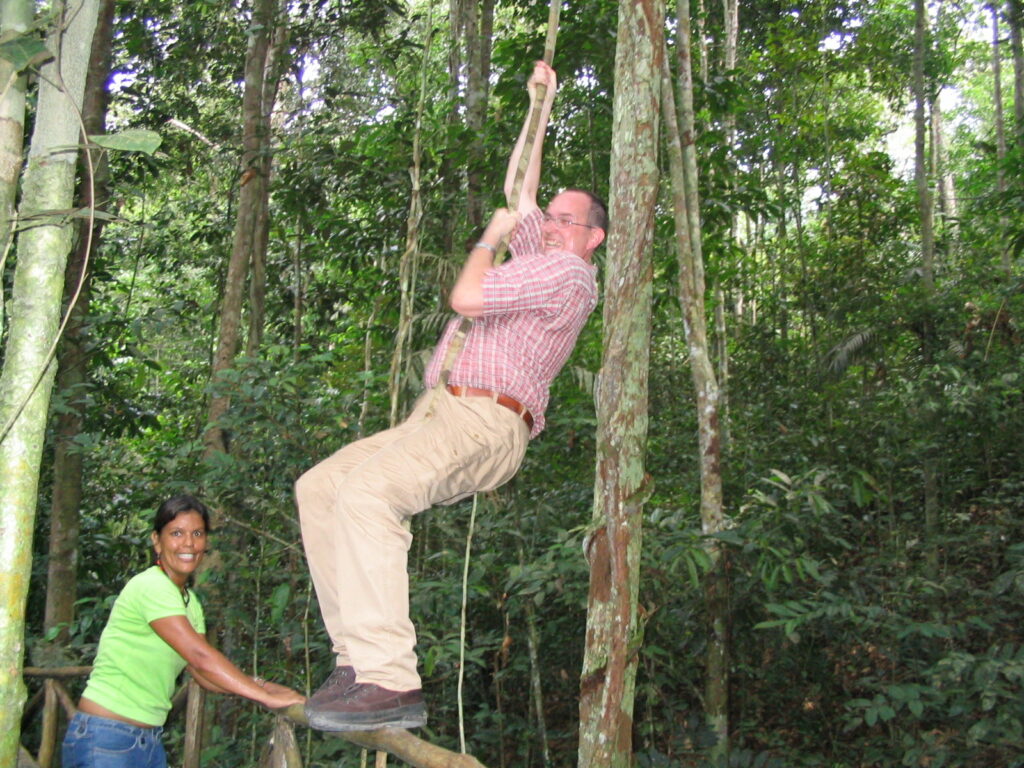 Harrie wordt tijdelijk Tarzan als hij aan de lianen hangt boven een 20 meter hoge afgrond. We volgen een boomtoppentour (canopy walk) die prachtig op het resort is aangelegd.