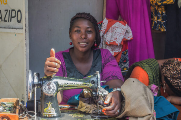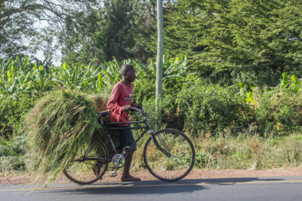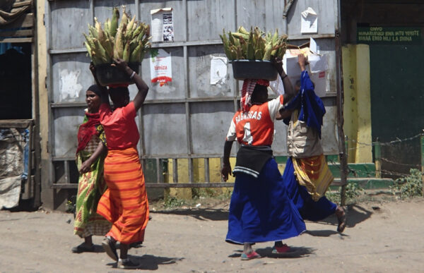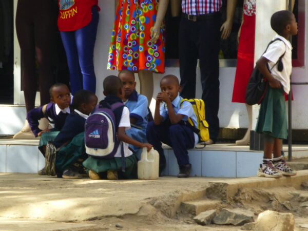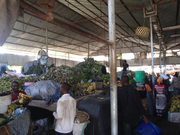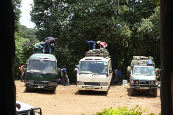 Later, op onze heen- en terugreis naar Kilimanjaro Nationaal Park, zien we dat er op de berghellingen onder meer aardappels, koffie, maïs en bananen geteeld worden. Hier worden deze producten volop verhandeld. Wat ook opvalt is de enorme handel in schoenen.