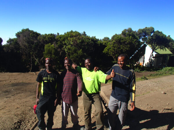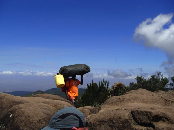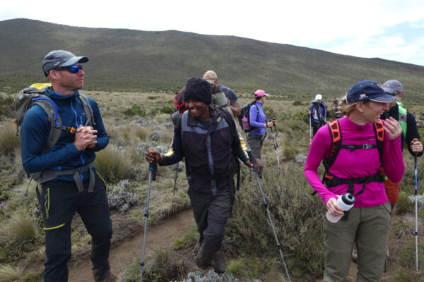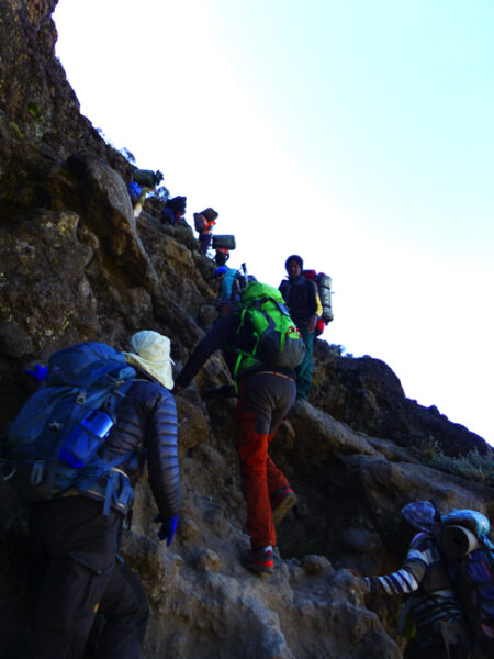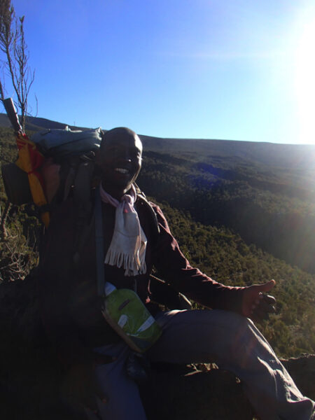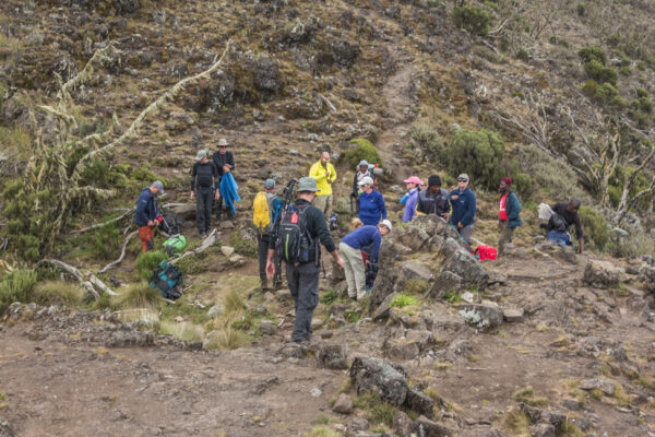 “Pole Pole”. Op deze hoogte is het belangrijk om het tempo laag te houden, voor je het weet ben je buiten adem. John doet dat perfect en weet de groep samen met de andere gidsen bij elkaar te houden.
