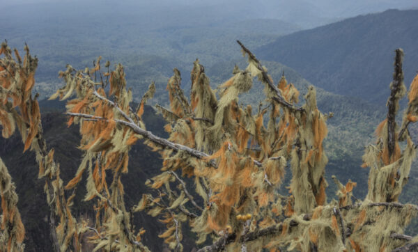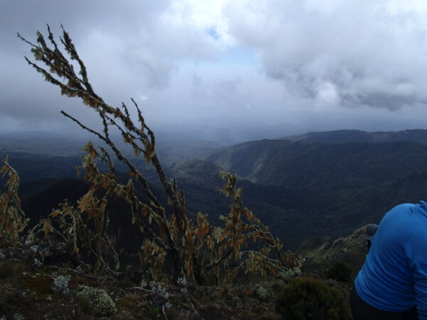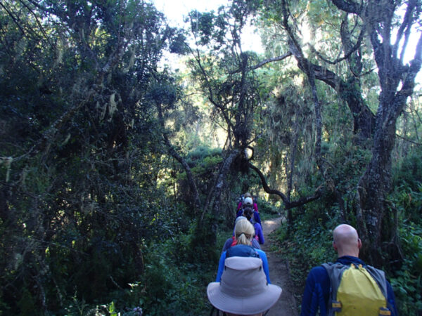 Het is een mooie, maar lange afdaling, de begroeiing op 3800 meter is eerst nog vrij laag, we lopen nog boven de wolken, langzaam lopen we door de wolken heen en komen we weer in het regenwoud met zijn fraaie baardmossen waar ook een aap ons af en toe begroet.