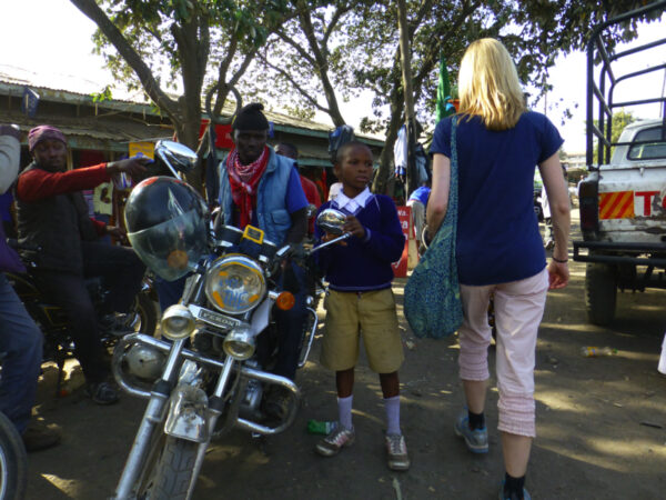 Om 12:00 u lopen we door Arusha, maar niet voordat we afscheid genomen hebben van onze New Yorkse vriendin Yvonne.
