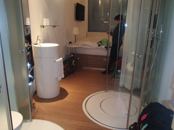CitizinM is een modern, redelijk eenvoudig, maar goed en betaalbaar hotel. In- en uitchecken doe je zelf bij binnenkomst.