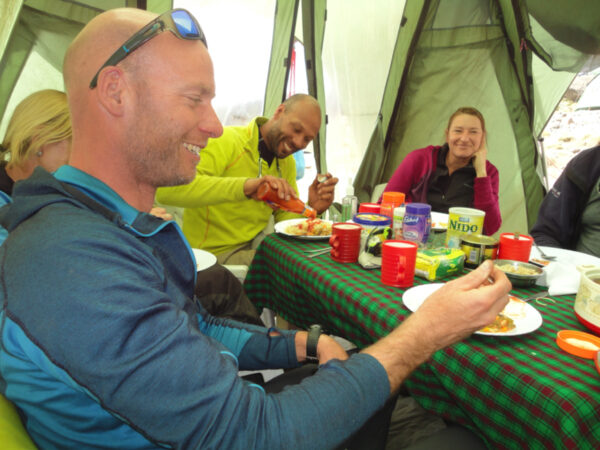 Tijdens het diner vertelt Taco dat we om 06:30 u ontbijten, de rugzak en de duffel voor de porters moeten dan al gepakt klaar staan.